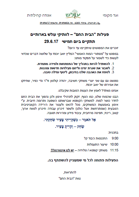 מצ"ב פעילות "הבית החם" ליום חמישי 29.6.17 – לוותיקי עולש ובארותיים